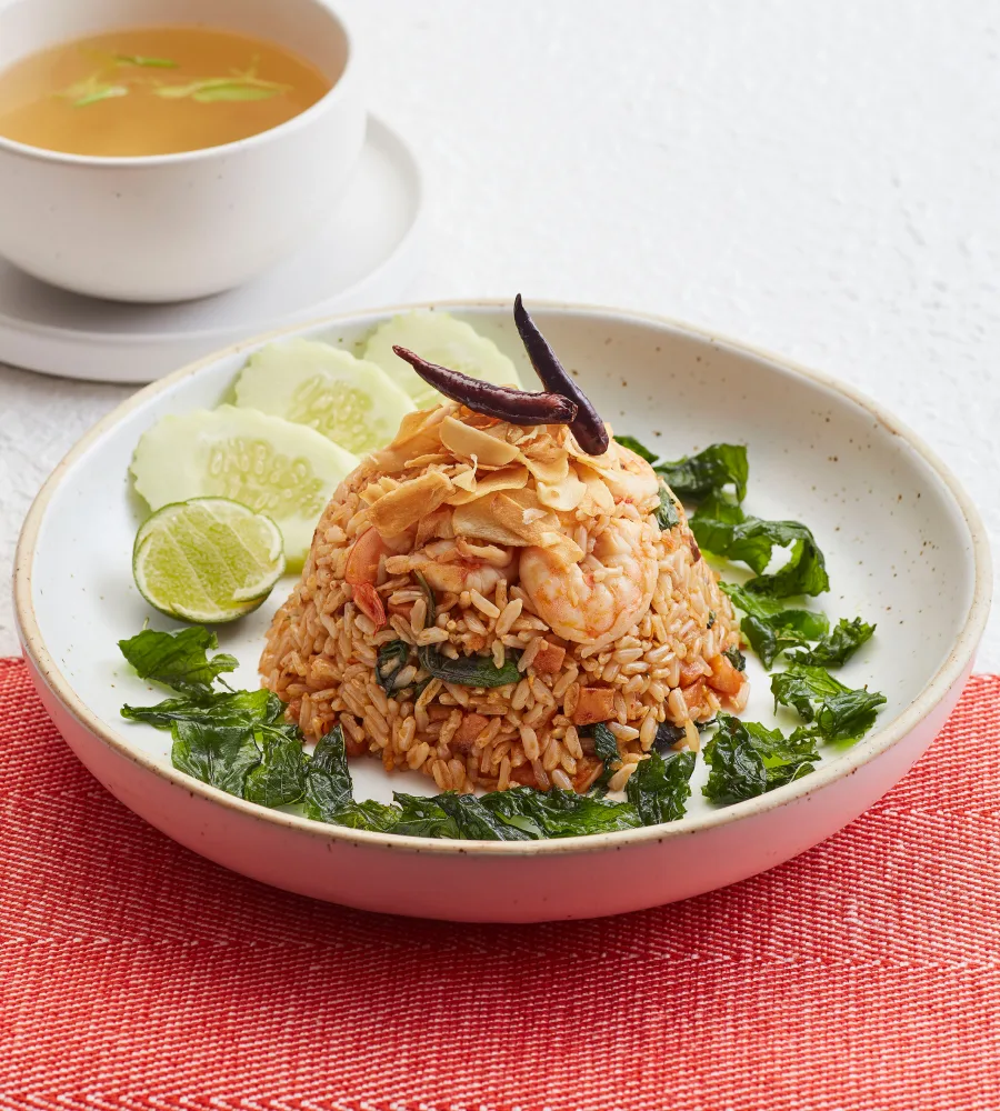 ข้าวกล้องออร์แกนิกกุ้งผัดปลาสละเค็มทอดกะเพรากรอบ เสิร์ฟพร้อมซุปผัก