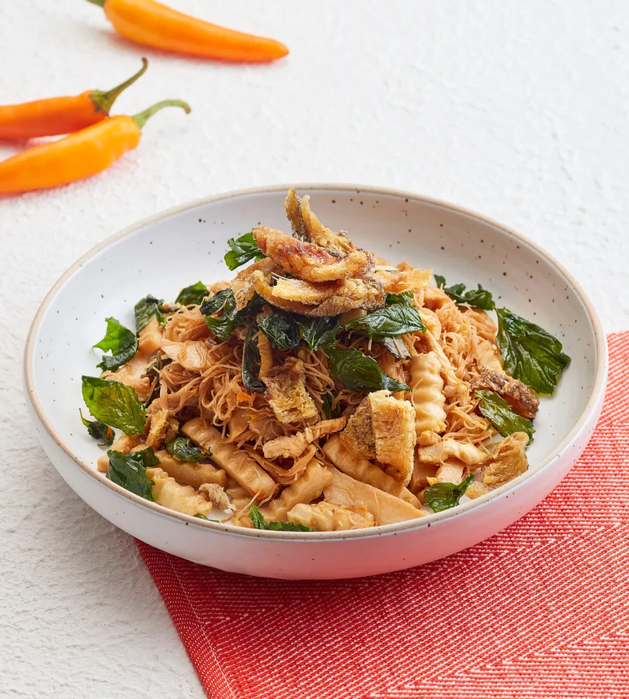 ผัดหมี่กล้องรสแซ่บปลาสลิดกะเพรากรอบ