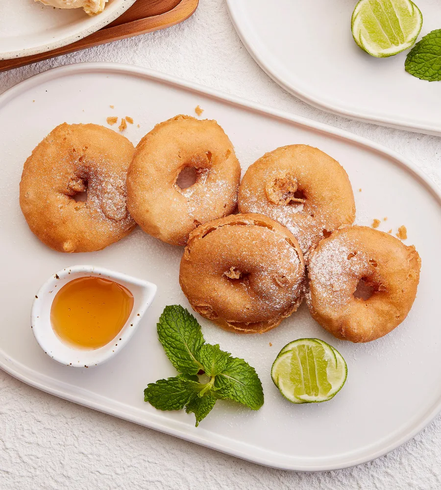 แอปเปิ้ลทอดแป้งสเปลท์ออร์แกนิกเสิร์ฟกับน้ำผึ้งและมะนาว